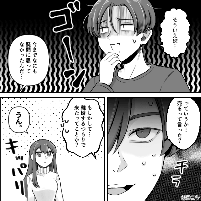 夫は「俺と離れて生きていけるの?俺はどっちでもいいけどね!この家で残った女と暮らせばいいんだ」と主人公をバカにしたような発言をしました。 その発言に困惑した主人公は、この家は主人公名義で、売るつもりであることを夫に伝えます。