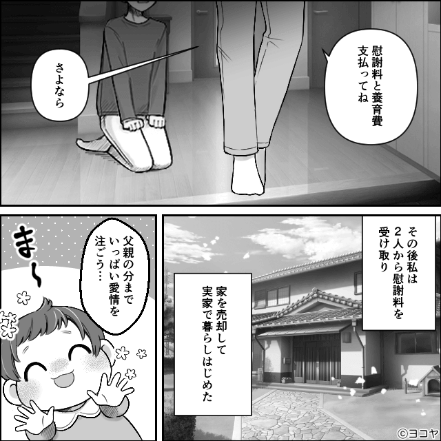 大泣きして、主人公にすがってきた夫。 しかし主人公は夫を許さず、その後、家を売却して実家で暮らし始めます。