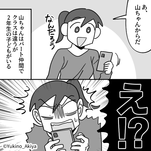 主人公が娘と家でお昼ご飯を食べていると、パート仲間から連絡がきて…。