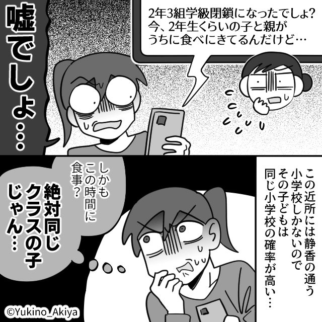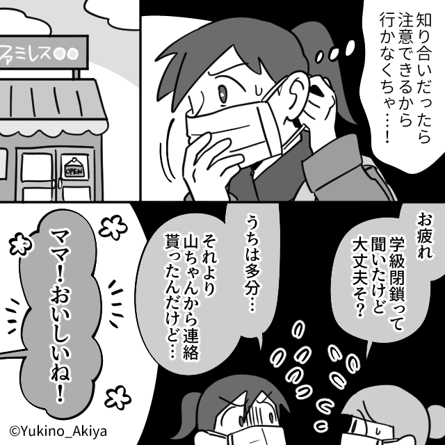 今回は『「うちの子はかかってないから(笑)」学級閉鎖中に娘を連れ回す非常識ママの末路』を紹介します。 学校から自宅待機をお願いされ、娘と家でお昼ご飯を食べていた主人公。 するとパート仲間から連絡がきて、主人公はその内容に驚愕するのでした。