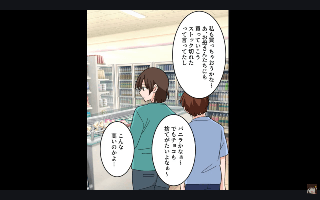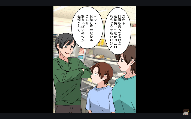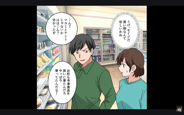 息子が「今日暑いしアイス食べない?」と言ったため、主人公は息子と一緒にスーパーへ向かいました。 すると偶然再会した夫が、主人公に「お前も冷凍食品買いにきたんだろ」「やっぱり使ってたんだな!」と言い、息子には「お前も不幸だなぁ」「こんな怒りっぽいやつが母親なんて」と言って…。