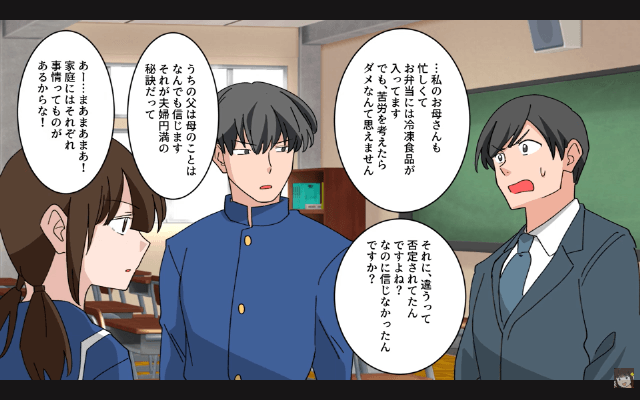 夫は主人公の話を真剣に聞く学生たちに「プライベートはずぼらだぞ」「冷凍食品ばっか食わせてくるんだ」と主人公の悪口を言いました。 すると学生たちはそんな夫に「私のお母さんも忙しくてお弁当には冷凍食品が入ってます」「でも、苦労を考えたらダメなんて思えません」と言って…。