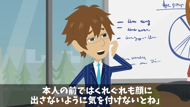 従業員が「こんなこと言ったらなんだけど、早く終わってほしいわね」と言うと、もう1人の従業員もそれに同意しました。 そして主人公は「本人の前ではくれぐれも顔に出さないように気をつけないとね」と従業員たちに言ったのです。