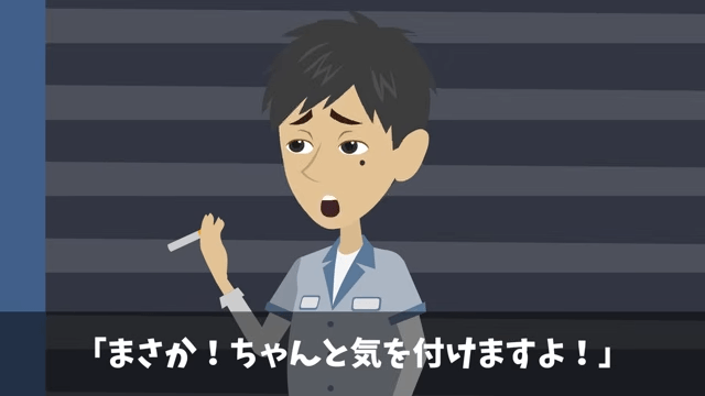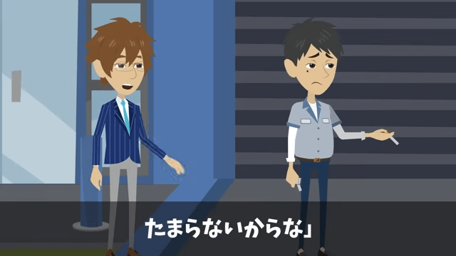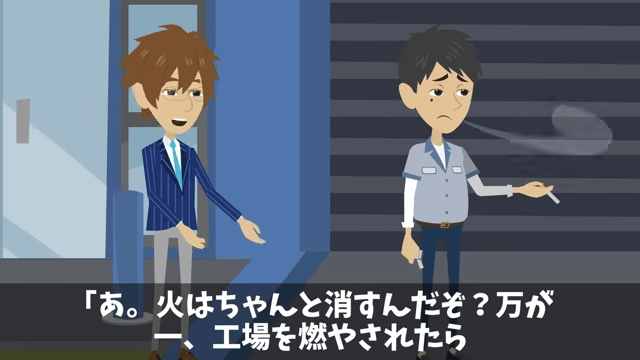 今回は『取引先「ボロ工場との契約は破棄で(笑)」俺「はーい」直後⇒勘違いに気づいた取引先は絶句』を紹介します。 妻から事情を聞いた主人公は、取引先の副社長と元同僚たちに「お前ら、今度こそマジメにやるんだぞ?」と声をかけました。 その後、疲れた様子の取引先の副社長がタバコを吸いに外に出ると…。
