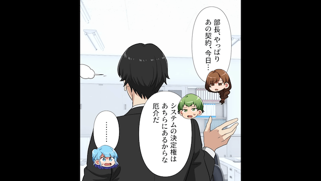 男性社員が社内に戻ってきたため、部長は新システムの問題点を挙げて「再検討すべきでは?」と意見しました。 しかし男性社員は「この俺の決定だ!黙って従え!」とまったく話を聞こうとしなかったのです。