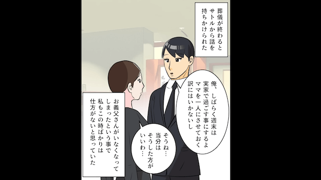 義父が庇ってくれたことを嬉しく思っていた主人公でしたが、それから1週間後、義父が急逝してしまいました。 そして義母を心配した夫は、毎週末、義実家へ行くことになったのですが、2ヶ月が経っても夫は義実家に通い続けて…。