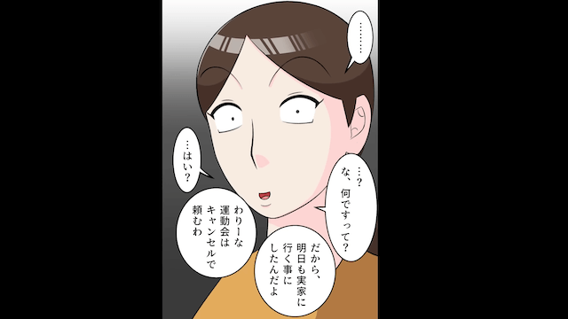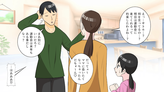 しかし運動会の前日、夫が「やっぱりママが心配だから明日も実家に行ってくるわ!」「運動会はキャンセルで頼むわ」と言い出して…。