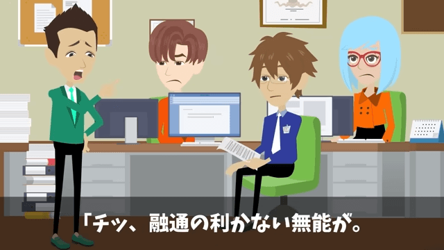 家族旅行を経費で処理しようとする係長に、主人公は「虚偽報告はできません」と言いました。 すると係長は「チッ、融通の利かない無能が」と舌打ちして…。
