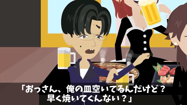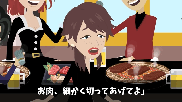 今回は『新年会に勝手に家族10人連れてきた上司の末路』を紹介します。 係長の家族に席を乗っ取られてしまった主人公たちは、立ち尽くすしかありませんでした。 すると係長の妻が主人公たちに「ほら、子どもたちの分のお肉、細かく切ってあげてよ」と命じてきて…。