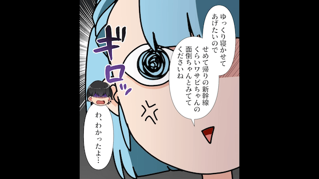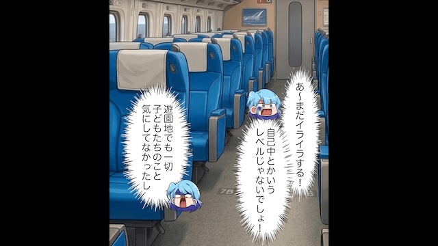 義姉の体調を心配し、予定より早く帰宅することにした主人公たち。 駄々をこねていた姪をなんとかなだめ、義兄に世話を任せて新幹線に乗り込みました。