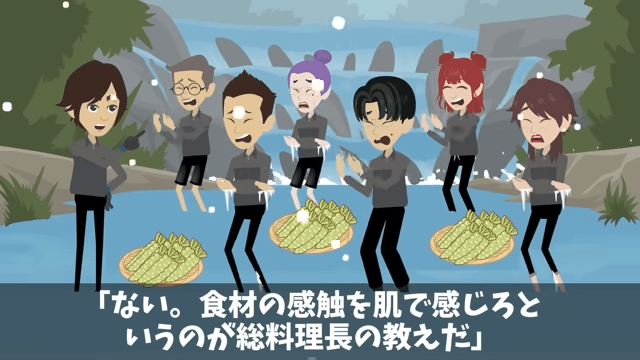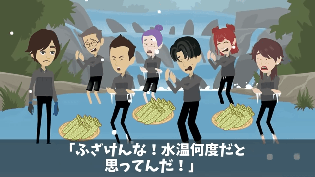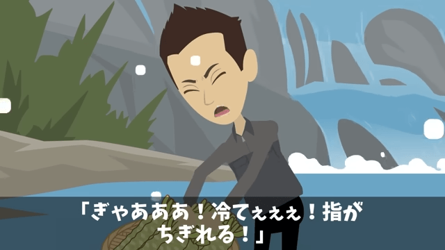 係長たちは極寒の中、素手でワサビを洗うことになりました。 そして係長は「ぎゃあああ!冷てぇぇぇ!指がちぎれる!」と悲鳴を上げ…。