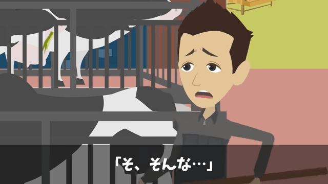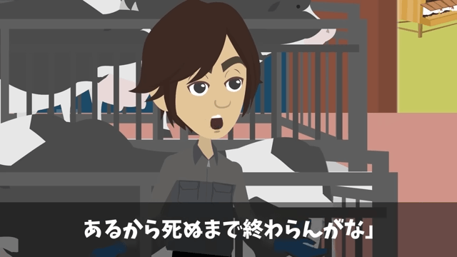 今回は『新年会に勝手に家族10人連れてきた上司の末路』を紹介します。 係長たちは、監督の指示で牛の世話をすることになりました。 監督は「お前らが食った肉もこうやって育てられてるんだぞ」と言いますが、作業を始めた係長は「おぇぇぇ…!臭い…目が痛い…」と顔をしかめて…。