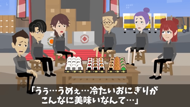 今回は『新年会に勝手に家族10人連れてきた上司の末路』を紹介します。 監督は「焼肉弁当は従業員用だ。お前らにはもったいない」と言い、係長たちにコンビニのおにぎりを差し出しました。 そして落胆した係長が「匂いだけ…匂いだけでも…!」と言うと、監督は「惨めだな。まあ、しっかり味わって食えよ」と言い…。