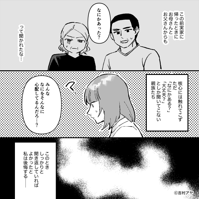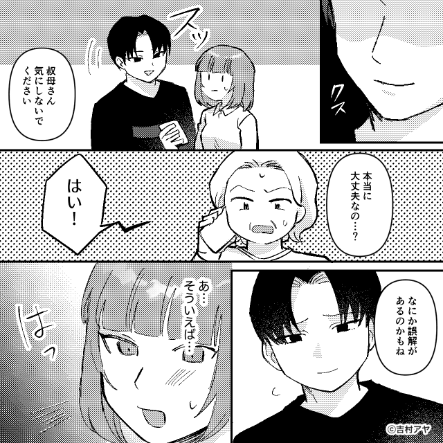結婚式の1週間前、叔母から電話で「なにか隠してることはない?」と尋ねられた主人公。 主人公が困惑していると夫が電話を代わり、叔母に「気にしないでください」と伝えます。
