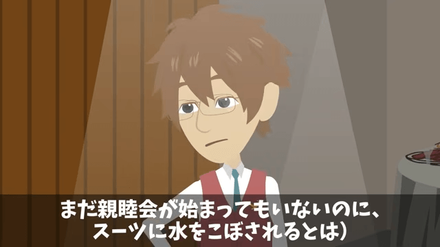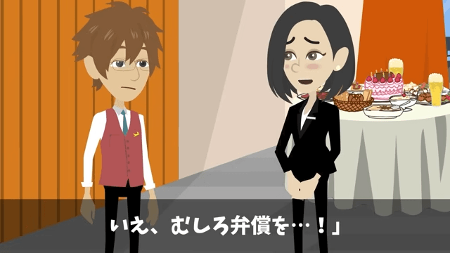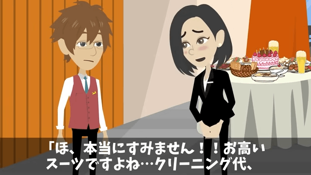 ある日、大規模な親睦会に参加した主人公は、着ていたスーツに水をこぼされてしまいました。 すると従業員が「ほ、本当にすみません!」と頭を下げ、主人公に弁償を申し出て…。