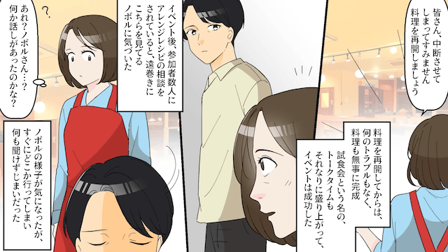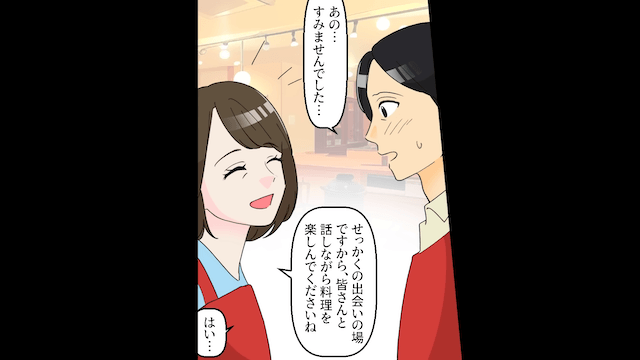 陰口を言う女性たちや不機嫌な男性によって空気が悪くなった婚活イベントで、声をあげた主人公。 すると女性たちや男性は反省して謝罪し、イベントはなんとか成功しました。