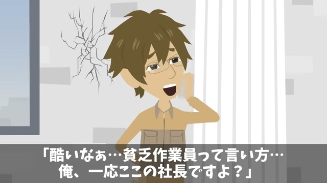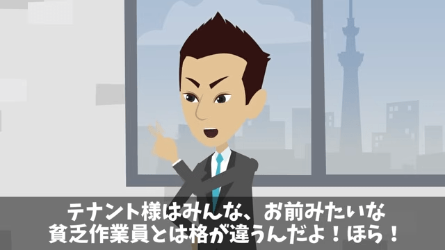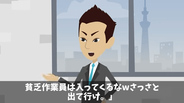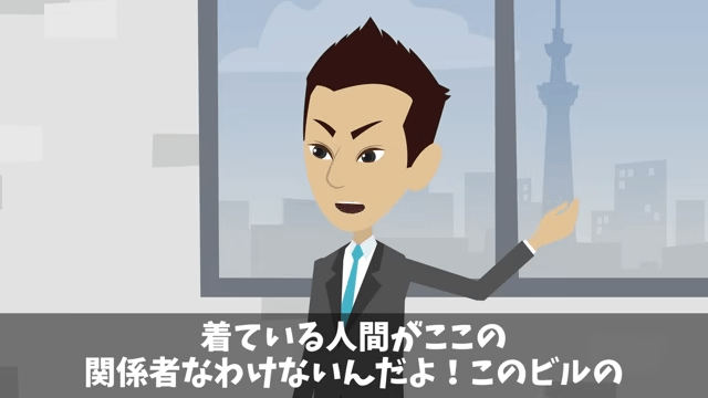 ビルのオーナーは主人公に向かって「貧乏作業員は入ってくるな。さっさと出て行け」と言いました。 そこで主人公は、自分が社長であることをオーナーに伝えるのですが…。