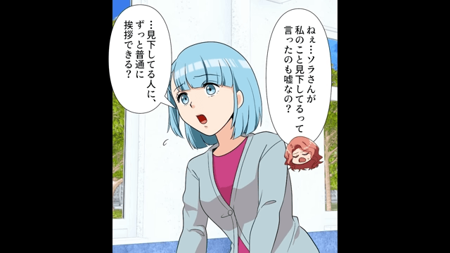 女性が嘘をついていたのだと知ったママ友は、主人公に「私のこと見下してるって言ったのも嘘なの?」と尋ねました。 すると主人公は「…見下している人に、ずっと普通に挨拶できる?」と聞き返して…。