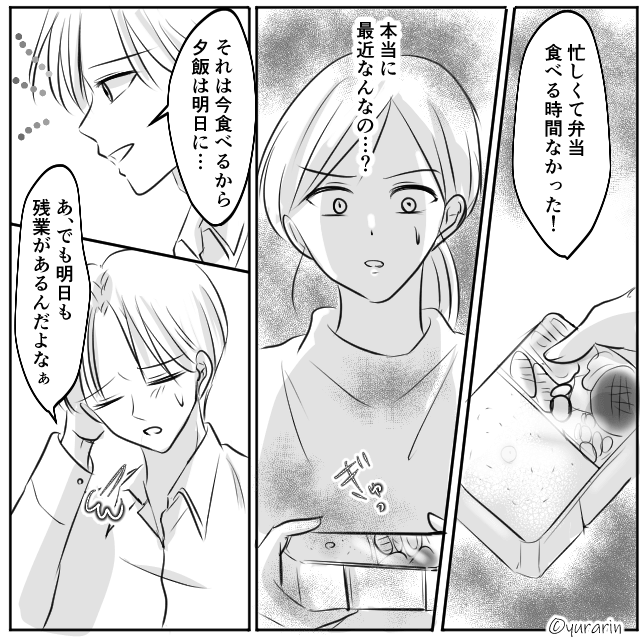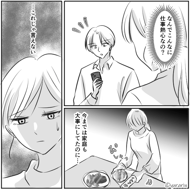 結婚記念日にもかかわらず、夫は仕事へ行ってしまいます。 その日から夫は休日に呼び出されることや残業が明らかに増え、主人公は不満が募っていくのでした。
