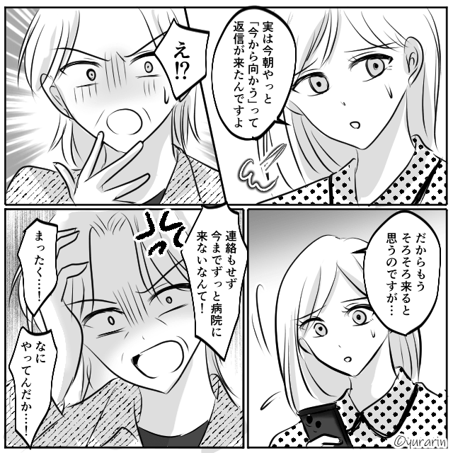 翌日、義母も到着して「お疲れ様」と主人公に声をかけてくれました。 夫の行方を知らない義母が「連絡はついたかしら…?」と尋ねてきたため、主人公は「今朝やっと返信がきたんですよ」と答えます。