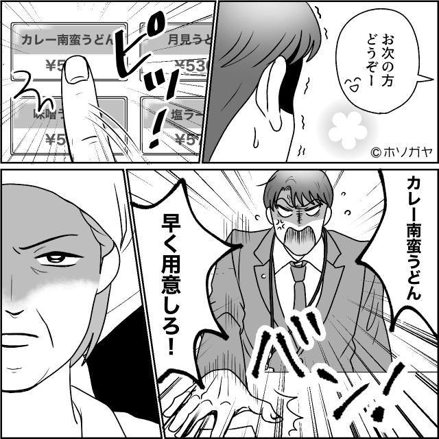 嫌がらせをした男性社員は、主人公の焦っている姿を見るために食堂へやってきました。 しかしいつも通りの食堂を見て、イライラし始めます。