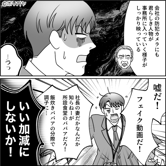 焦った男性社員は捏造だと主張し始めますが、社長に「恥を知れっ!」と一喝されてしまうのでした。