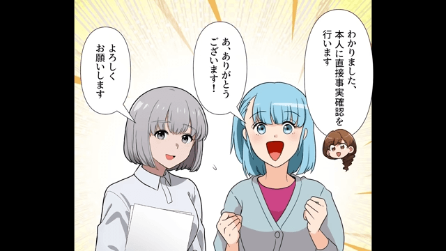 主人公はまとめた資料を持って大学の学生課の窓口に行きました。 すると、事情を聞いた職員が「わかりました、本人に直接事実確認を行います」と言ってくれたため、主人公は「あ、ありがとうございます!」とお礼を言ったのです。