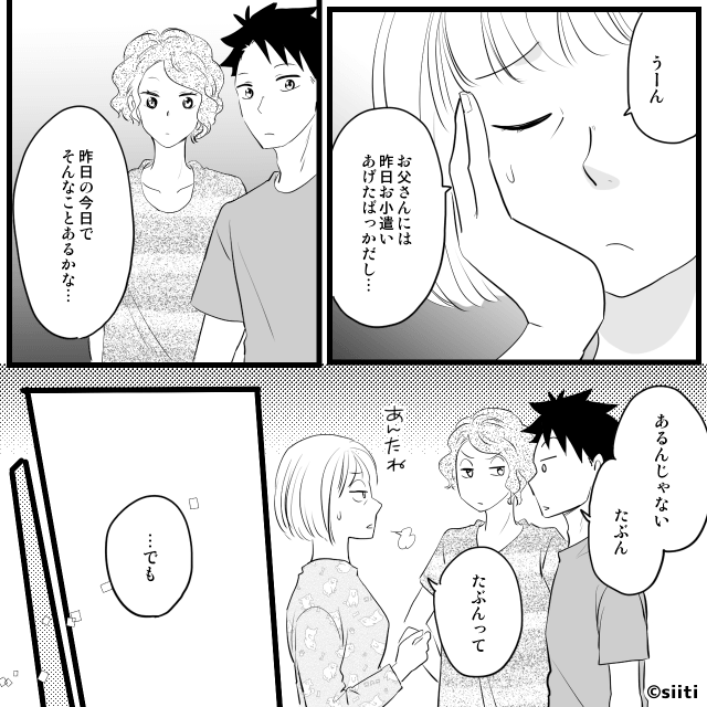 その場にいない父の可能性も考えますが、母は「お父さんには昨日お小遣いあげたばっかだし…」と頭を悩ませるのでした。