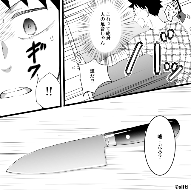 その瞬間、何者かが逃げていく足音がして、主人公がドアを開けるとそこには包丁が落ちていたのでした。