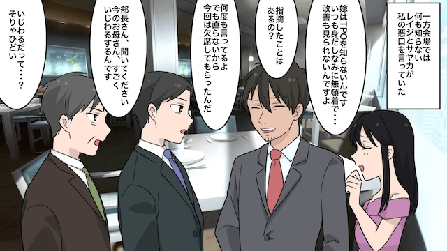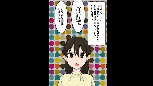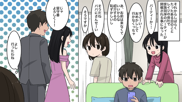 あるとき、夫の会社で家族同伴のパーティーが開かれることになり、主人公は留守番を任されました。 しかし2人に恥をかかせる絶好のチャンスだと考えた主人公は、パーティーのために着飾って…。