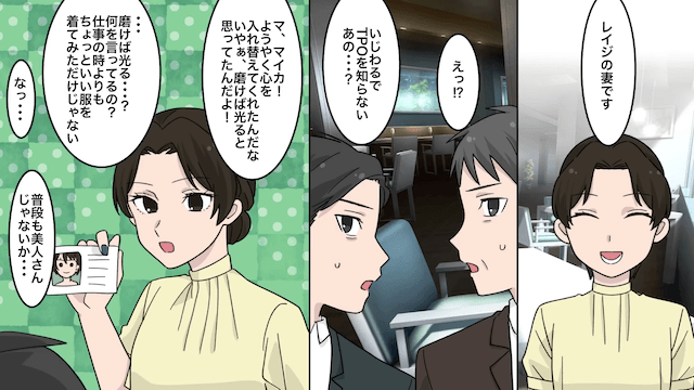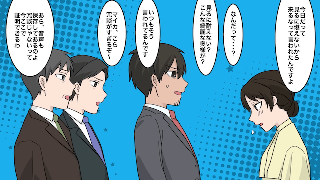 娘は上司の息子と距離を縮めるため、主人公から嫌がらせを受けていると嘘をついて泣きつきました。 しかしそこに主人公が登場し、夫と娘の普段の態度を暴露したのです。