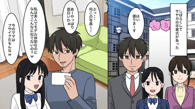 夫と娘の行動がエスカレートしたため、主人公はついに離婚を決意しました。 それからしばらく経ったころ、卒業式の写真を見た娘が「本当のお母さんと撮りたかったなぁ」と言い出したため、主人公は「じゃあ本当の母親呼んであげるね」と言い、電話をかけて…。