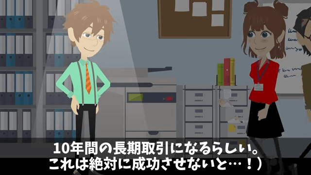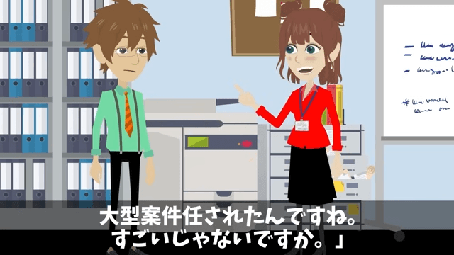先輩からプロジェクトを任された主人公は「これは絶対に成功させないと…」と気合を入れます。 するとそこに「大型案件任されたんですね。すごいじゃないですか」と後輩が話しかけてきました。