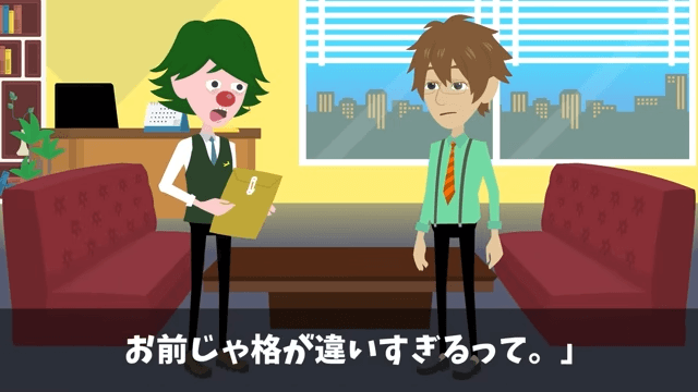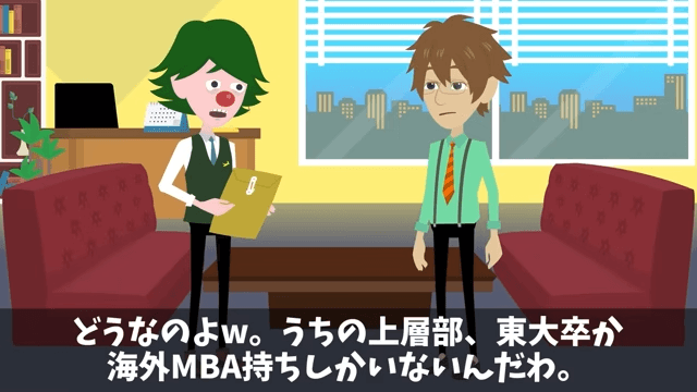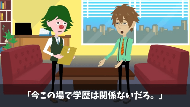 同級生は大手商社の上層部は高学歴ばかりだから主人公とは格が違いすぎると言いました。 それに対し主人公は「今この場で学歴は関係ないだろ」と言い返したのですが…。