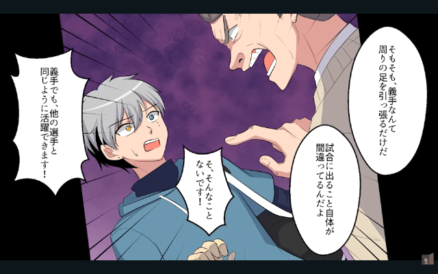 甲子園へ向けた地区予選大会の本番当日、主人公は事故に遭った男性を助け、遅刻して会場に入りました。 すると監督は主人公の遅刻理由を信じなかった挙句「そもそも、義手なんて周りの足を引っ張るだけだ」「試合に出ること自体が間違ってるんだよ」と言ってきて…。
