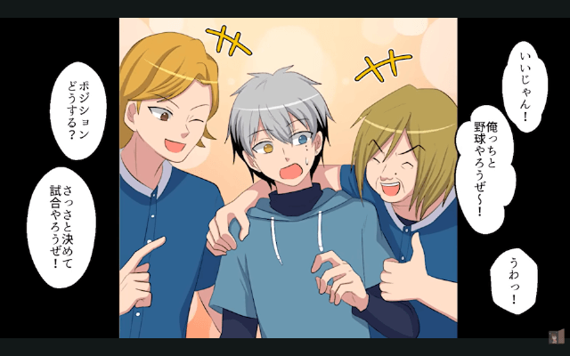 主人公は野球が好きな同級生が作ったという草野球チームに連れていかれ、困惑していました。 すると草野球の選手たちが「ポジションどうする?」「さっさと決めて試合やろうぜ!」と言ってきたため、主人公はとても逃げ出せる雰囲気ではないと思って…。