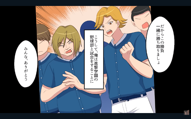 同級生が「私ならあなたの炎上騒動も解決できます」と言うと、監督は草野球チームとの試合を受け入れました。 そして監督が去った後、仲間たちが「俺らが一緒に仇を取ってやるよ!」と言ってくれたため、主人公は試合に向けて一生懸命に練習をして…。