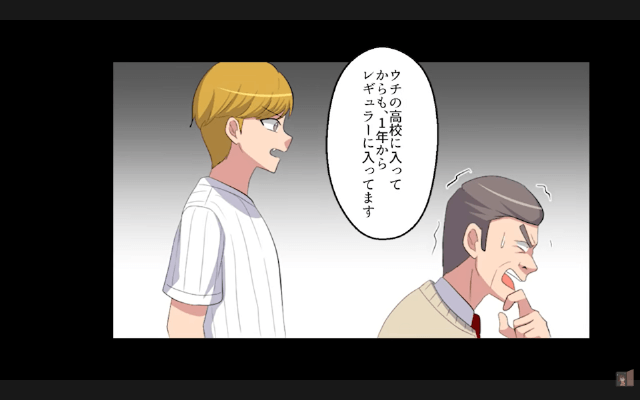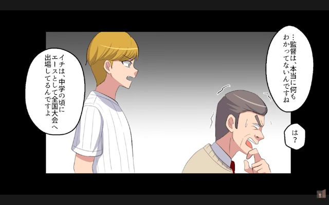 主人公が次々にスーパープレーを連発したため、監督は「どうして、あんな義手野郎が活躍してるんだ!」「ありえない!」と言いました。 すると部員が「彼は、中学のころにエースとして全国大会へ出場してるんですよ」「ウチの高校に入ってからも、1年からレギュラーに入ってます」と言って…。
