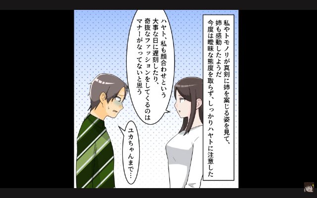 今回は『姉の婚約者がクズだった話』を紹介します。 主人公と夫が姉の婚約者と顔を合わせる日、姉の婚約者は遅刻をした上に、あまり場に適さない服装でやってきました。 呆れた主人公は姉の婚約者を注意したのですが、婚約者は話を聞こうとせず、姉も「2人も仲よくね」と言ってきて…。
