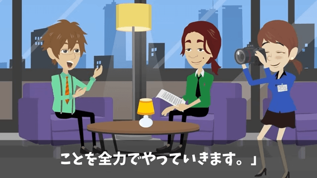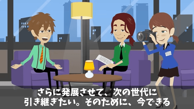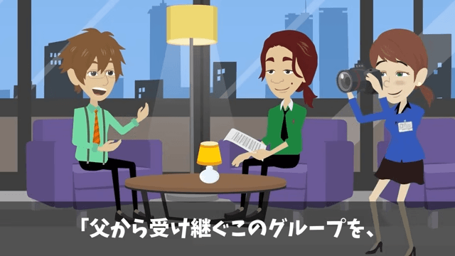 記者は「次期社長として、抱負をお聞かせください」と主人公に言いました。 それに対し主人公は「父から受け継ぐこのグループを、さらに発展させて、次の世代に引き継ぎたい」と答えて…。