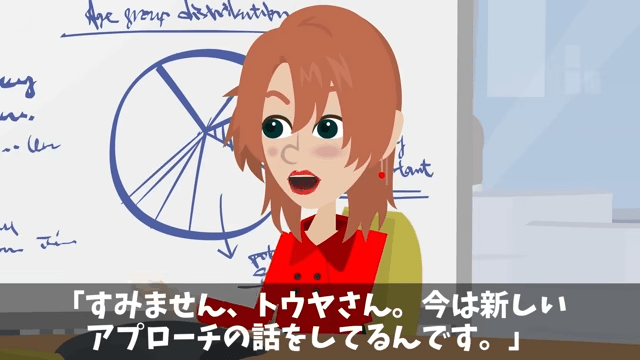 主人公は男性社員の話を遮り、取引先が長期的な信頼関係を重視する会社であることを説明しました。 すると女性社員は「今は新しいアプローチの話をしているんです」と言い…。