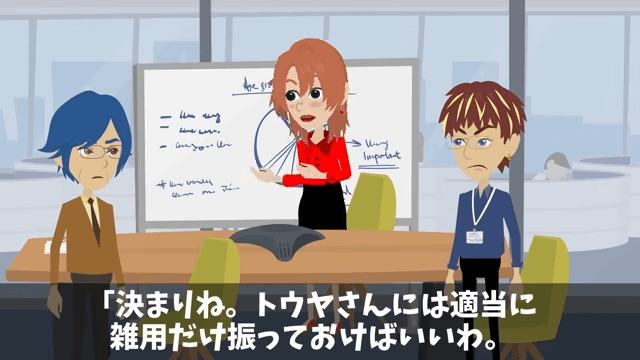 男性社員は、自分たちだけで効率的に進めたほうが絶対に成功すると言い切りました。 そして女性社員も、主人公には雑用だけを振っておけばいいと言い出して…。