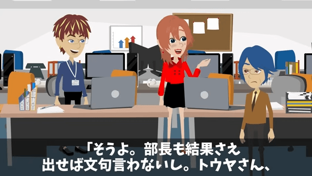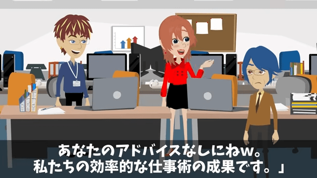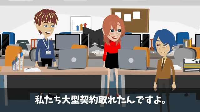 男性社員は改めて主人公が不要だと証明されたと得意げに言いました。 そして女性社員も「私たち大型契約取れたんですよ。あなたのアドバイスなしにね」と主人公に言い…。