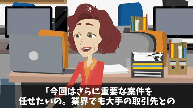 調子に乗った女性社員は、主人公に「これからも雑務に専念してくださいね」と言い放ちました。 そして数日後、部長は主人公たちに「今回はさらに重要な案件を任せたいの」と言い…。