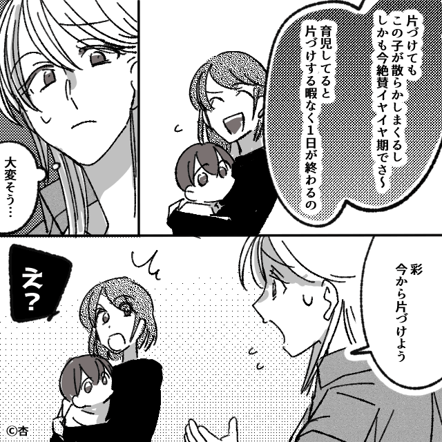 今回は『出産後に「激変」した親友の話』を紹介します。 ぐちゃぐちゃの状態の家に招かれ、困惑する主人公。 そして「こんな大変なら無理に遊ぶ必要もないのに…」とモヤモヤするのでした。