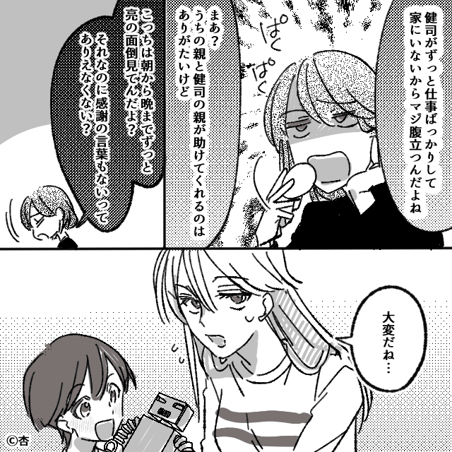 今回は『出産後に「激変」した親友の話』を紹介します。 主人公に家事や息子の相手を丸投げして、休憩する親友。 親友に「やっぱ面倒見いいね〜」と言われ、主人公は都合よく使われたように感じたのでした。