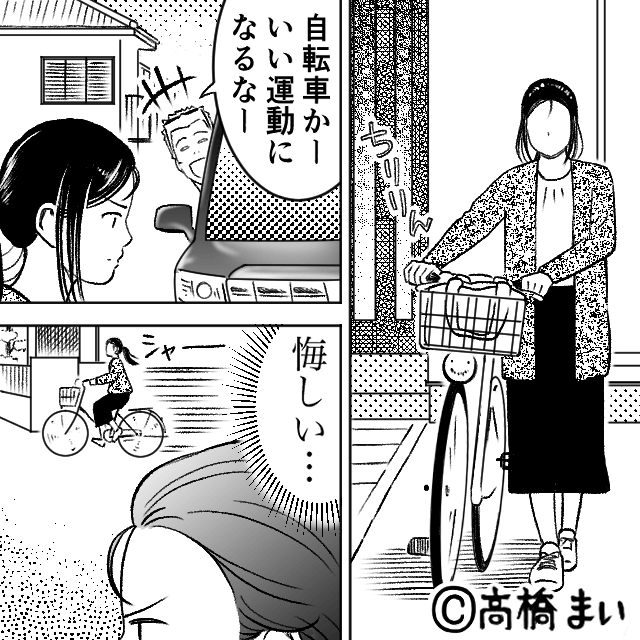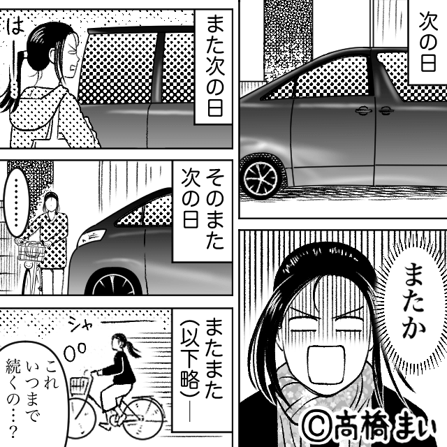 男性は主人公の家の前に車をとめ、主人公の車が出られないように嫌がらせをしてきました。 なにを言っても男性が退いてくれないため、主人公は自転車で通勤することに。