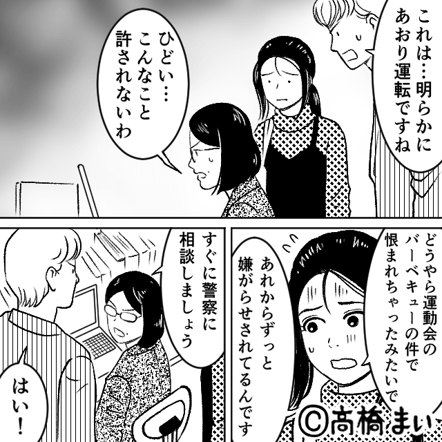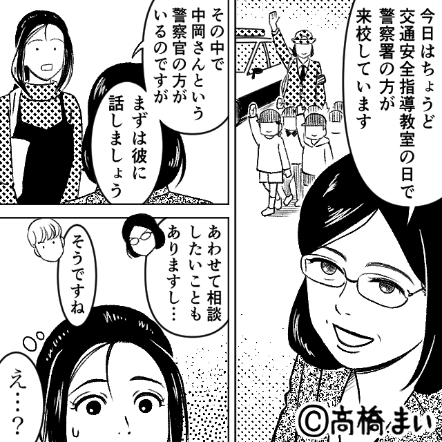 交差点で男性を振り切り、小学校に駆け込んで担任の先生と教頭先生に助けを求めた主人公。 教頭先生は主人公のドライブレコーダーを確認し「すぐに警察に相談しましょう」と言ってくれます。