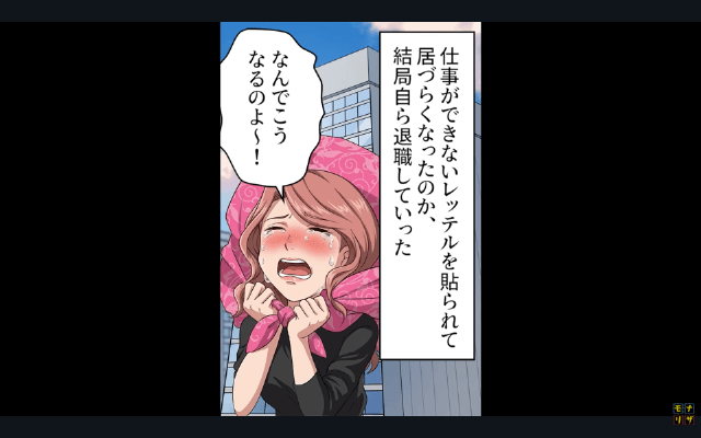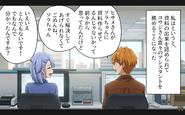 主人公や同僚に仕事を押しつけていた上司は厳重注意と1ヶ月の減給処分を言い渡され、周囲の目にも耐えられなくなって退職することに。 そしてその後、資料の出来を認められた主人公はリーダー直々のアシスタントとなり、これからも仕事を頑張ろうと決意するのでした。