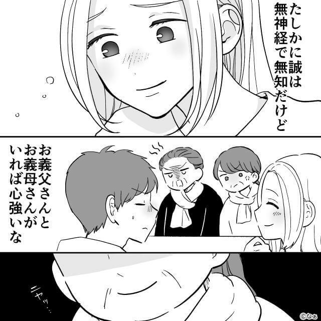 義両親は唖然としたあと、主人公に謝罪。 「勝手に報告したあんたは最低すぎよ」と夫を叱ります。